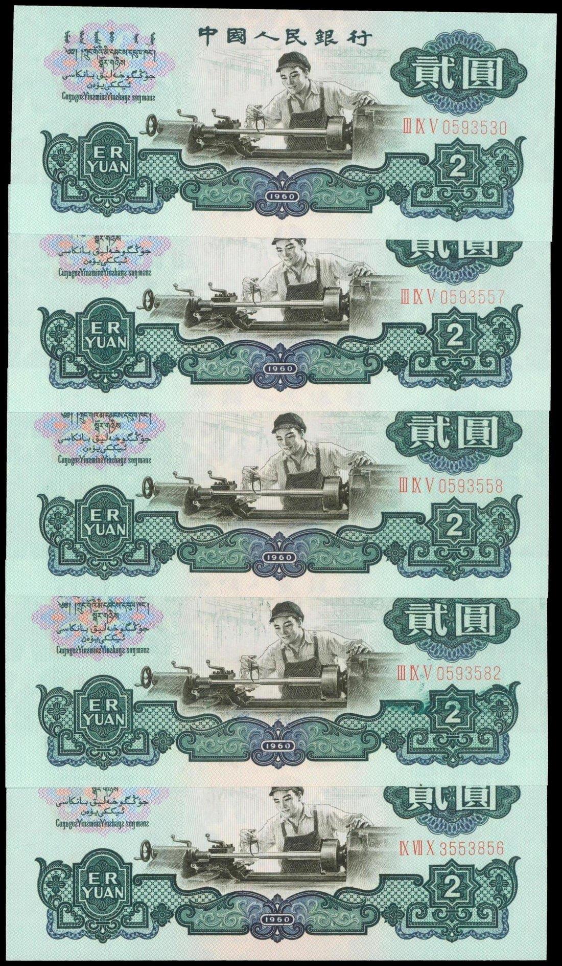 People's Bank of China, lot of 5x 2 yuan, 1960, serial numbers, III IX V 0593530, 557, 558, 582 and IX VII X 3553856, green and multicolour, machinist at centre,