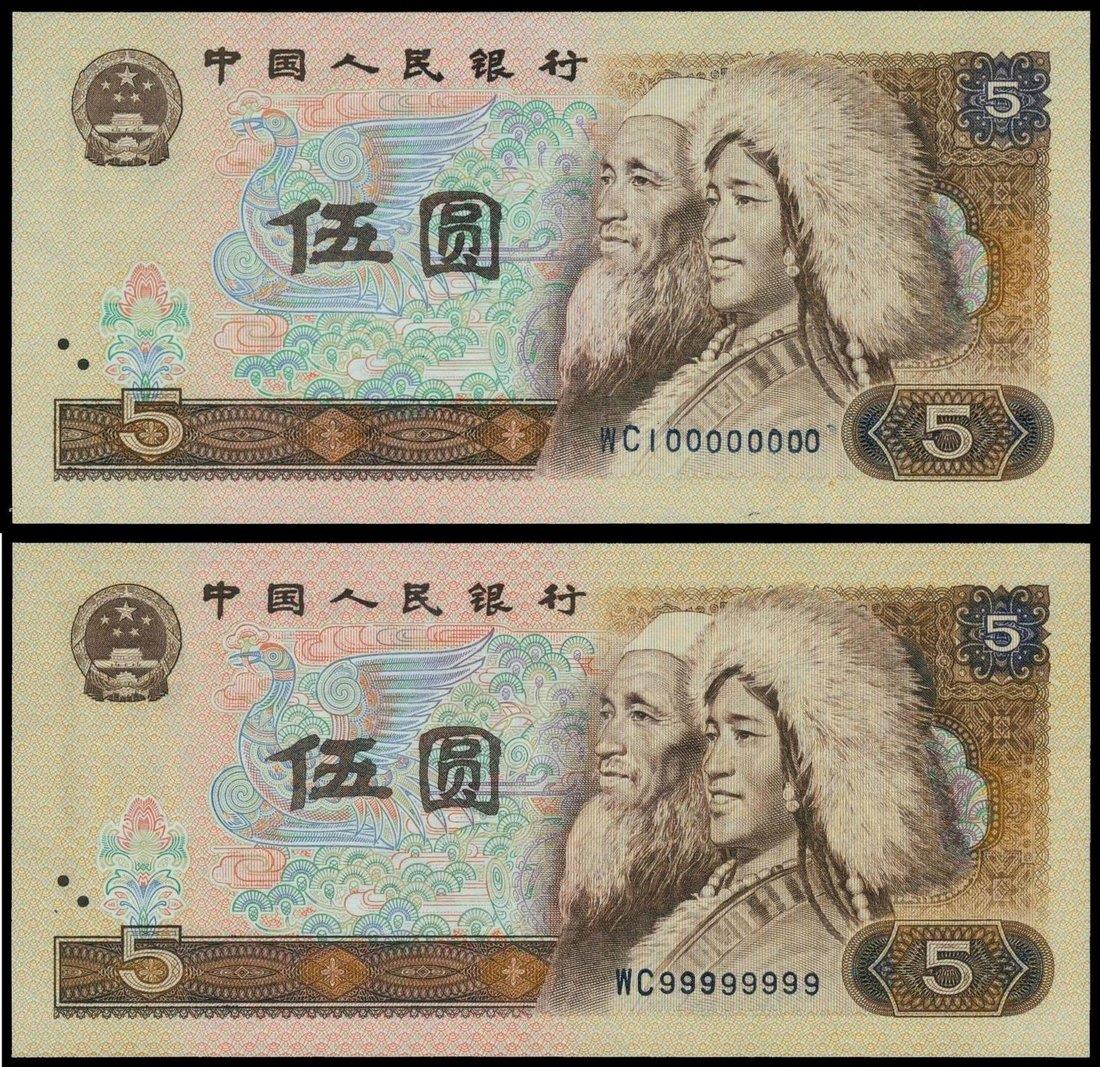 People’s Bank of China,4th series renminbi, a pair of 5 yuan, 1980, solid serial number WC99999999, WC100000000,brown on multicolour underprint, old Tibetan and young Islamic woman at right, reverse brown,