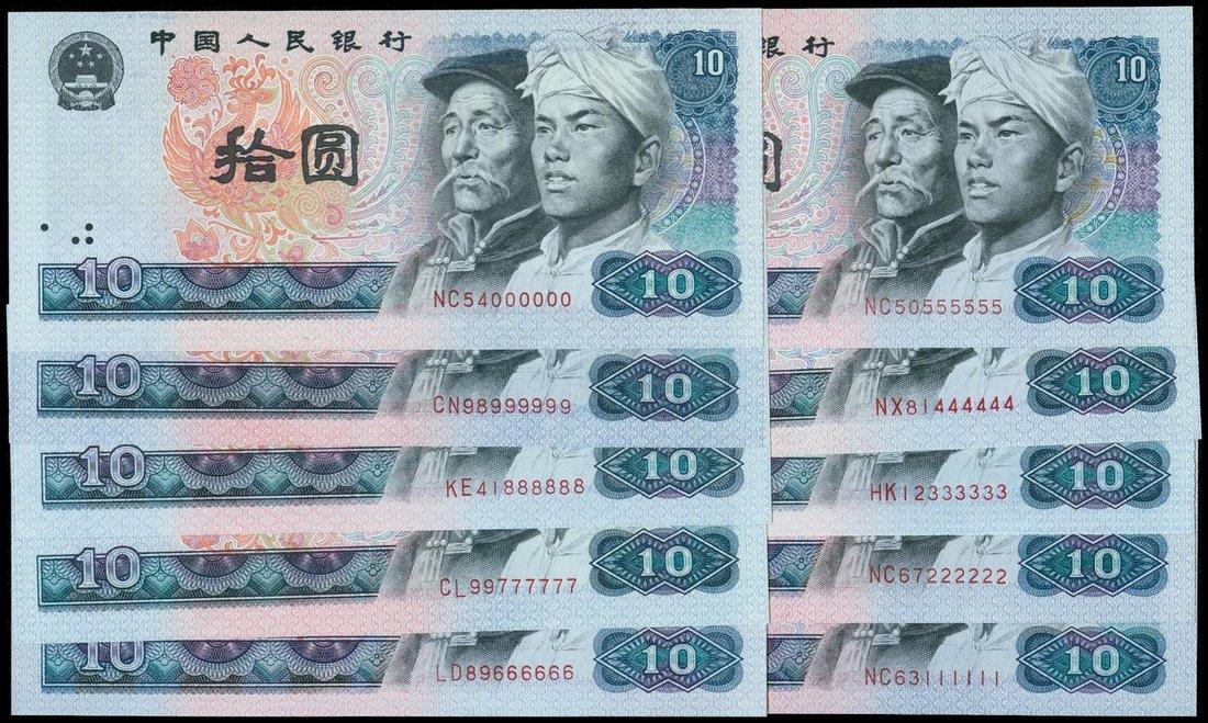 People’s Bank of China,4th series renminbi, 10 x 10 yuan, 1980, different two letters prefix, with the last six digits from 111111 to 000000, black on blue and multicolour underprint, elder Han and youthful Mongolian man at right,