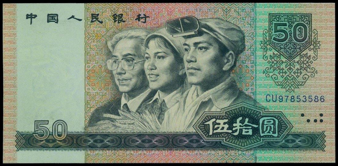 People’s Bank of China,50 yuan, 1980, rare dark blue serial number CU 97853586,black on light green and multicolour underprint, intellectual, farm girl and industrial male worker at centre, reverse black on light green, waterfalls of Yellow River at centre,