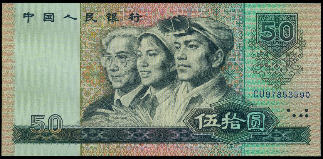 People’s Bank of China,4th series renminbi, 50 yuan, 1980, rare dark blue serial number CU 97853590,black on light green and multicolour underprint, intellectual, farm girl and industrial male worker at centre, reverse black on light green, waterfalls of Yellow River at centre,