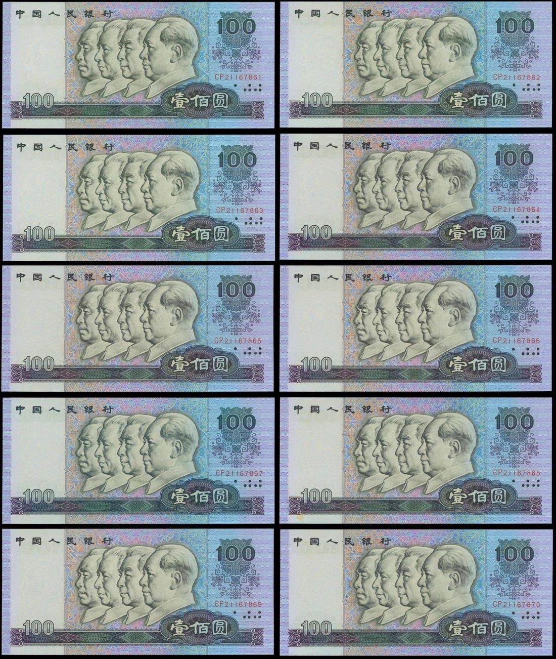 People’s Bank of China,4th series renminbi, consecutive run of 10 x 100 yuan, 1980, first issue, serial number CP21167861-70,black on multicolour underprint, four leaders at centre, reverse black on blue, mountains at centre,