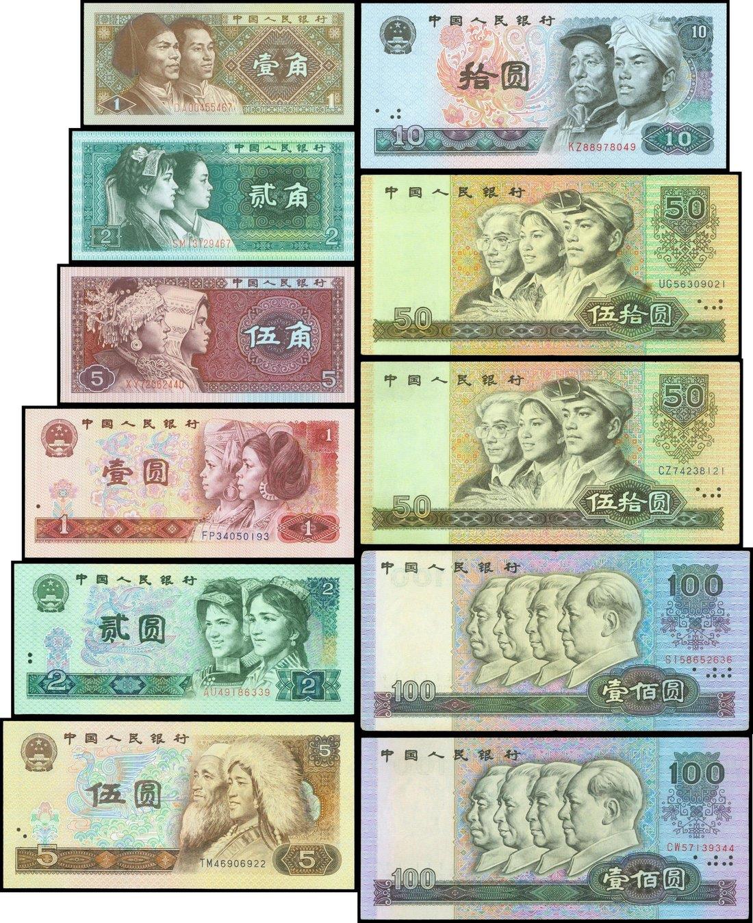People’s Bank of China,a set of 4th series renminbi, 1, 2, 5 jiao, 1, 2, 5, 10, 50(1980 and 1990), 100(1980 and 1990) yuan,
