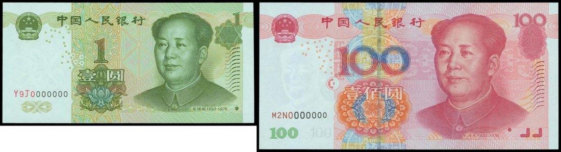 People's Bank of China, 5th series renminbi, 1 yuan and 100 yuan, 1999 and 2005, lucky serial numbers Y9J0000000 and M2N0000000, green and red respectively,
