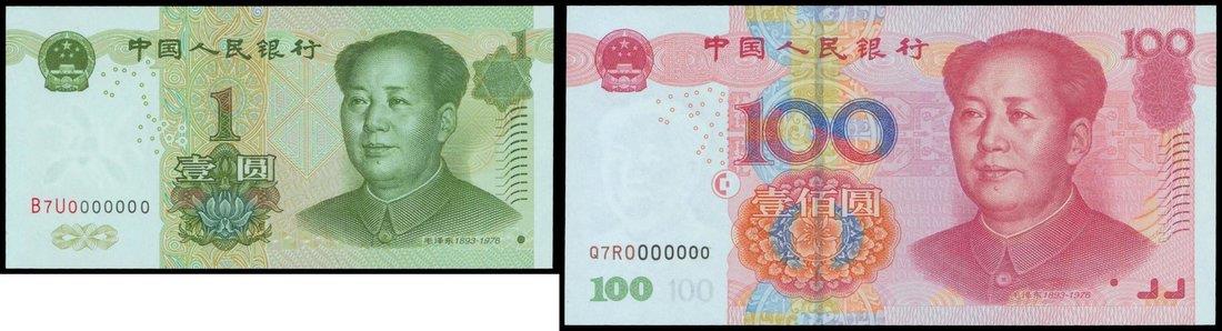 People's Bank of China, 5th series renminbi, 1 yuan and 100 yuan, 1999 and 2005, lucky serial numbers B7U0000000 and Q7R0000000, green and red respectively,