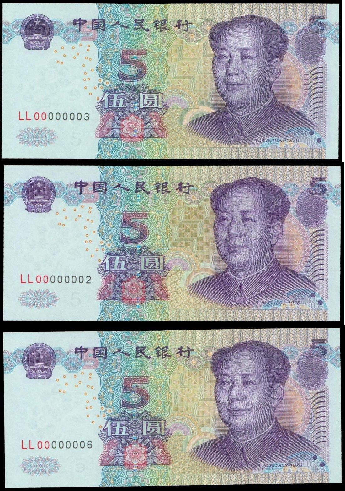 People's Bank of China, 5th series renminbi, 5 yuan, 2005, low serial numbers LL00000002, 00000003 and 00000006, purple on multicolour, Mao Zedong at right, mountains on reverse,