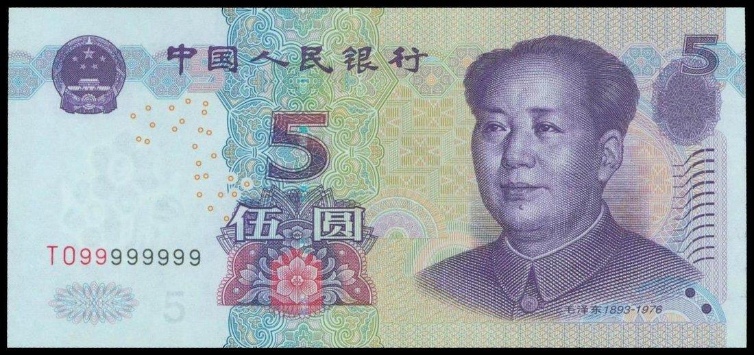 People's Bank of China, 5th series renminbi, 5 yuan, 2005, lucky serial number, TO 99999999, purple on multicolour, Mao Zedong at right, mountains on reverse,