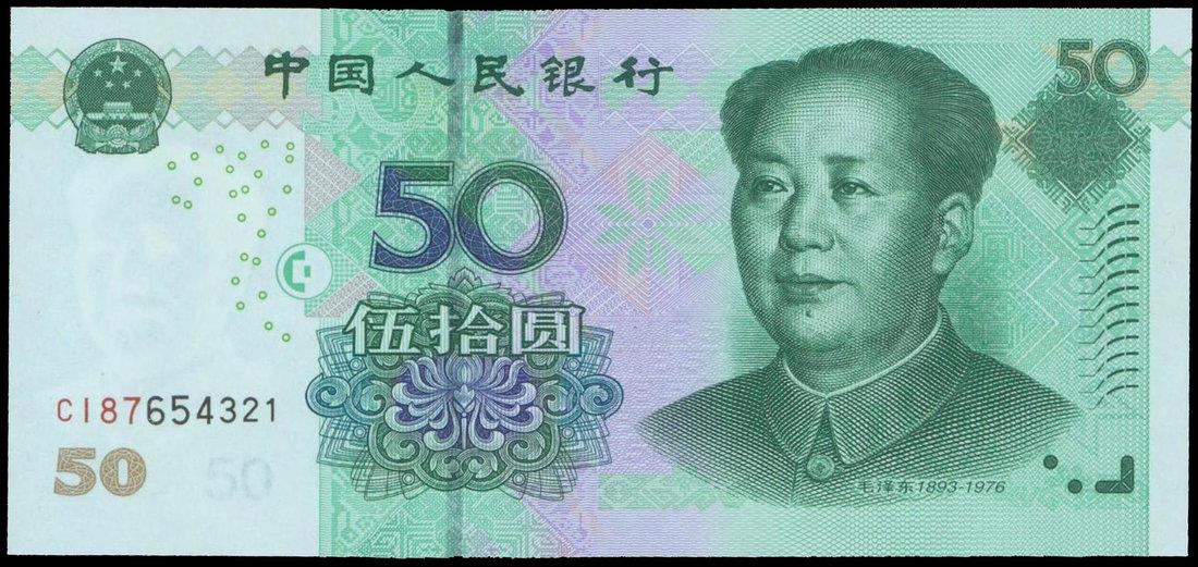People's Bank of China, 5th series renminbi, 50 yuan, 2005, lucky serial number, descending ladder, CI 87654321, green on multicolour, Mao Zedong at right, Potola Palace on reverse,