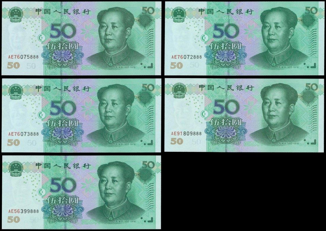 People's Bank of China, 5th series renminbi, 50 yuan, 2005, replacement prefix AE, all serial numbers end in '888',