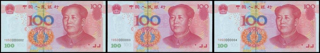 People's Bank of China, 5th series renminbi, 100 yuan, 2005, low serial numbers T0S0000002, 0000003 and 0000004, red on multicolour, Mao Zedong at right, Great Hall of the People on reverse,