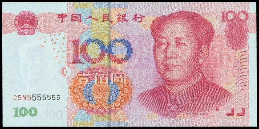 People's Bank of China, 5th series renminbi, 100 yuan, 2005, lucky serial number C5N5555555, red and multicolour, Mao Zedong at right, Great Hall of the People on reverse,