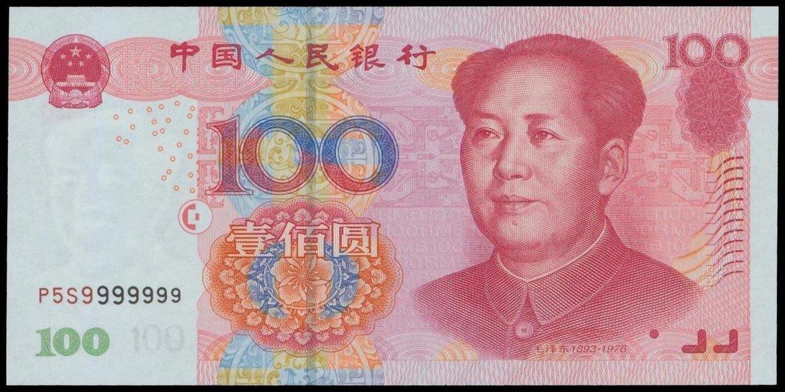People’s Bank of China,5th series renminbi, 100 yuan, 2005, solid serial number P5S9999999,red and multicolour underprint, Mao Zedong at right, reverse red and multicolour,