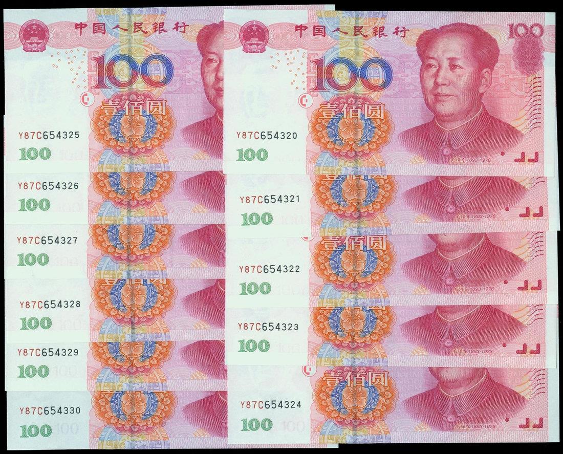 People’s Bank of China,100 yuan, 2005, descending serial number K8H7654321,red on multicolour underprint, Mao Zedong at right, reverse red, Great Hall of the People at centre,