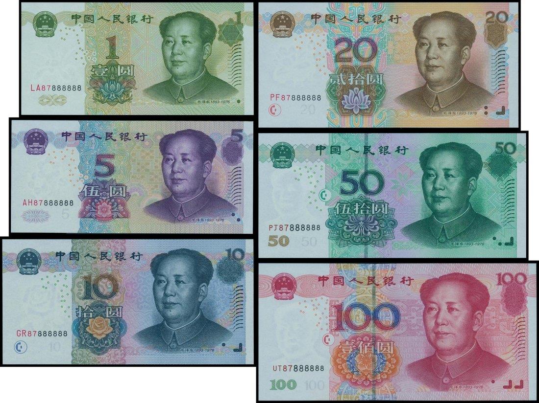 People’s Bank of China,a small set of 1, 5, 10, 20, 50 and 100 yuan, 1999 and 2005, all two letter prefix, semi lucky number 87888888,