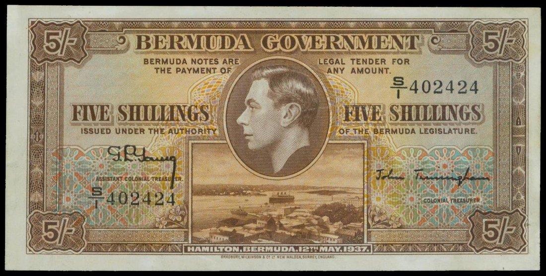 Bermuda,5 shillings, 1937, serial number S/1 402424,brown on multicolour underprint, George VI at upper centre,harbour view below, reverse brown, light green and violet,