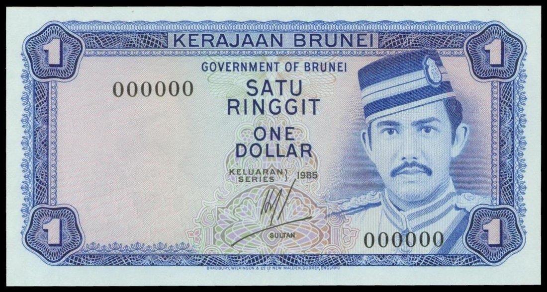 Brunei, 1 ringgit, 1985, serial number 000000, blue and multicolour, Sultan Bolkiah at right, mosque on reverse,