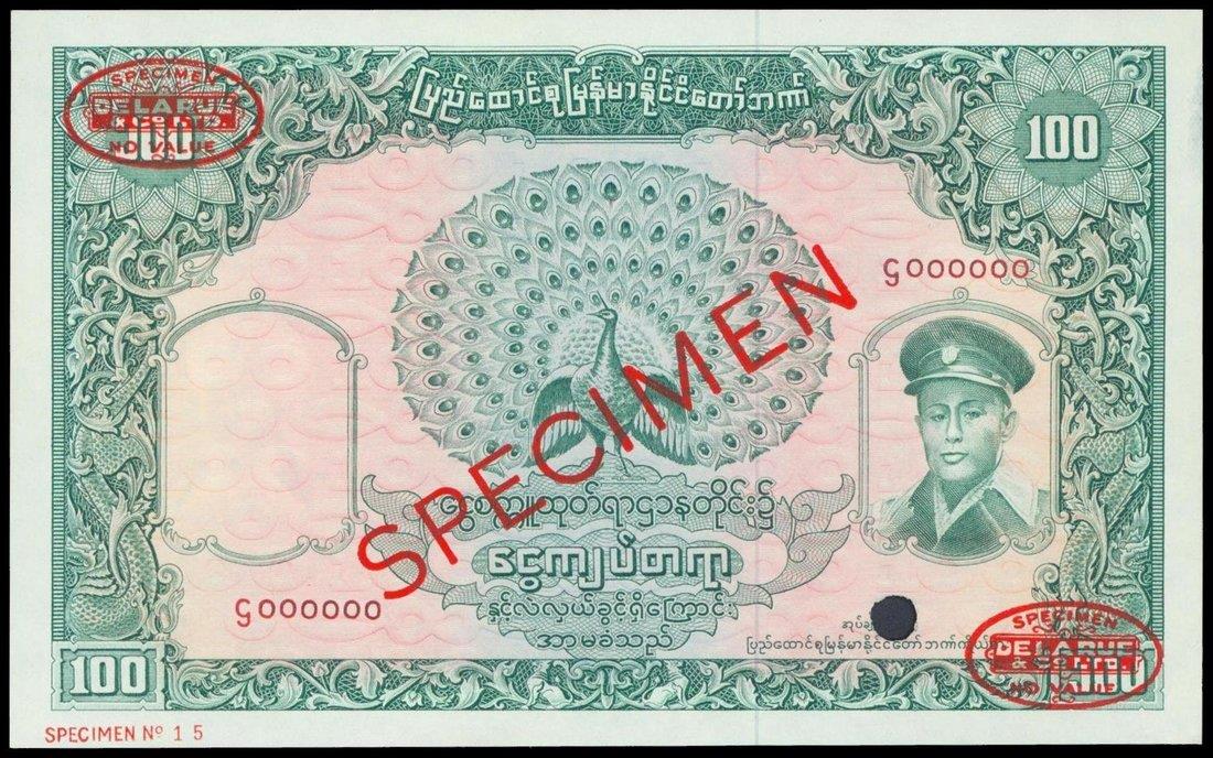 Union Bank of Burma, 100 kyats, specimen, no date (1958), green and pink, peacock at centre, General Aung san at right, reverse green, peasant ploughing with water buffalo at centre,