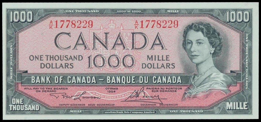Canada, $1000, series of 1954, serial number A/K 1778229, black and pink, Queen Elizabeth II at right, '1000' at each corner, reverse purple-pink, rural scene, signed by Lawson-Bouey,