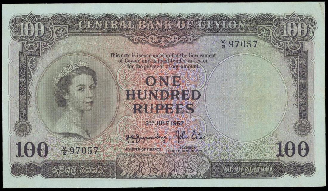Ceylon,100 rupees, 1952, serial number V/2 97057,olive-brown on multicolour underprint, Elizabeth II at left, reverse brown on light green and yellow, women at right,