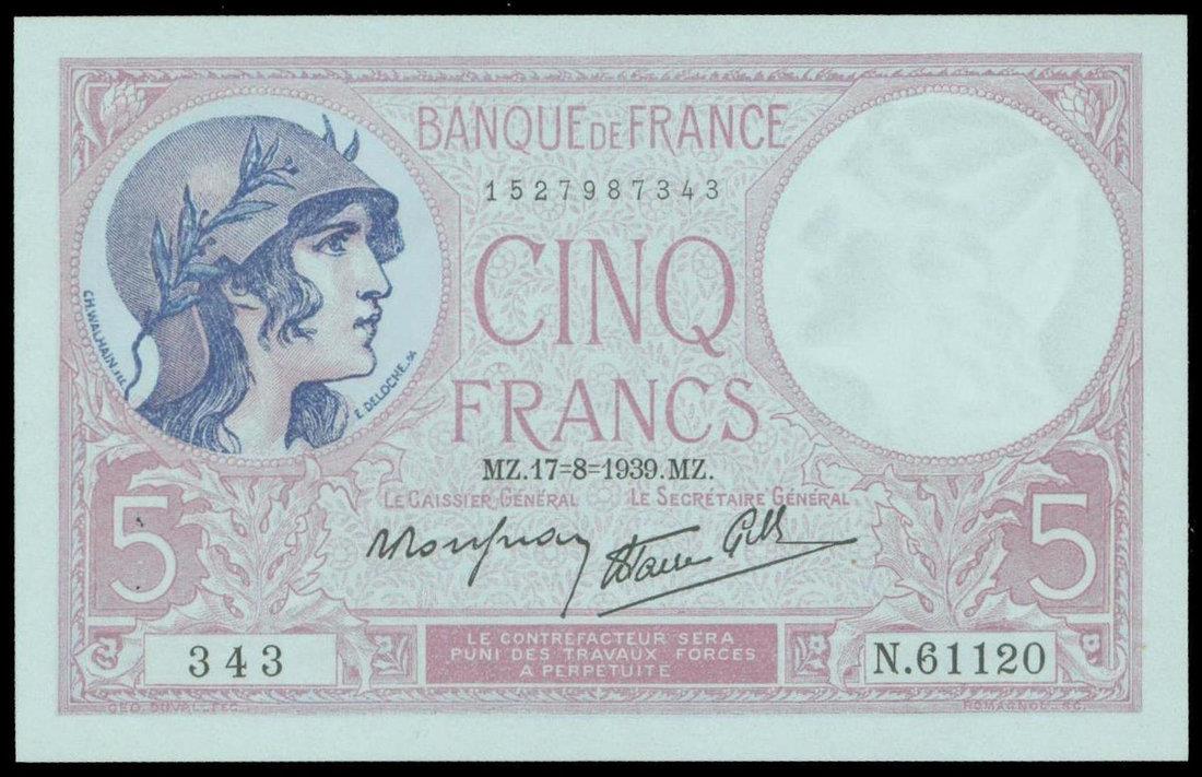 France,5 francs, 1939, serial number N.61120 343,lilac, woman wearing helmet at left, reverse grey lilac,
