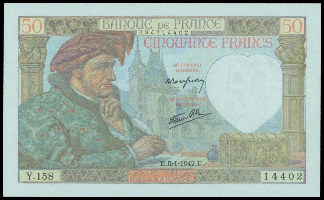 France,50 francs, 1942, serial number Y.158 14402,yellow-green and multicolour, Jacques Coeur at left, reverse green and multicolour,