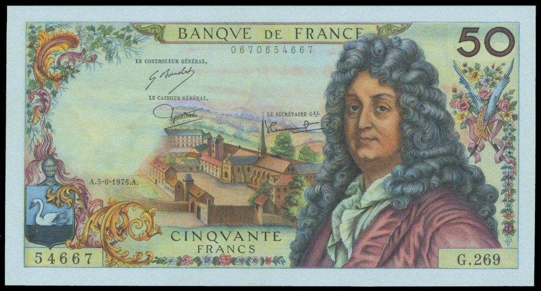France,50 francs, 1975, serial number G.269 54667,black and multicolour, Jean Racine at right, reverse multicolour,