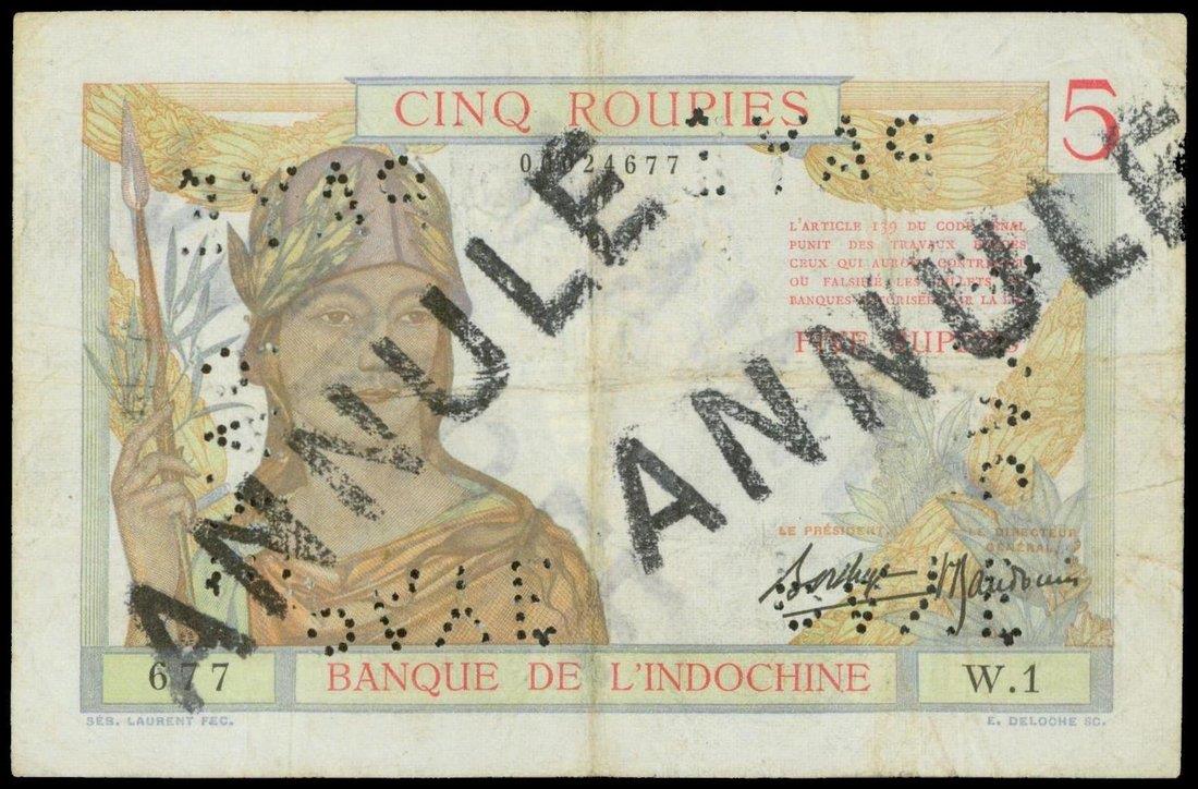 French India,5 roupies, ND(1937), serial number 00024677, cancelled,brown and orange on multicolour underprint, woman wearing helmet holding lance at left, reverse pale green and multicolour, woman with headress at left, temple at right,