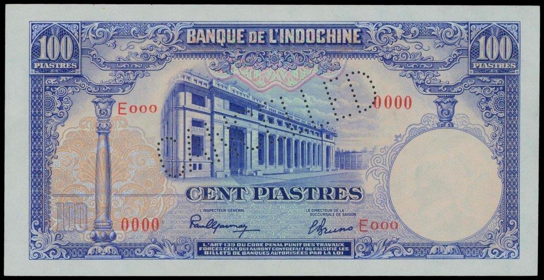 French Indo China, 100 piastres, specimen, no date (1946), serial number E000 0000, blue and orange, bank building at centre, watermark of a local woman at right, reverse blue, junk boats at centre,