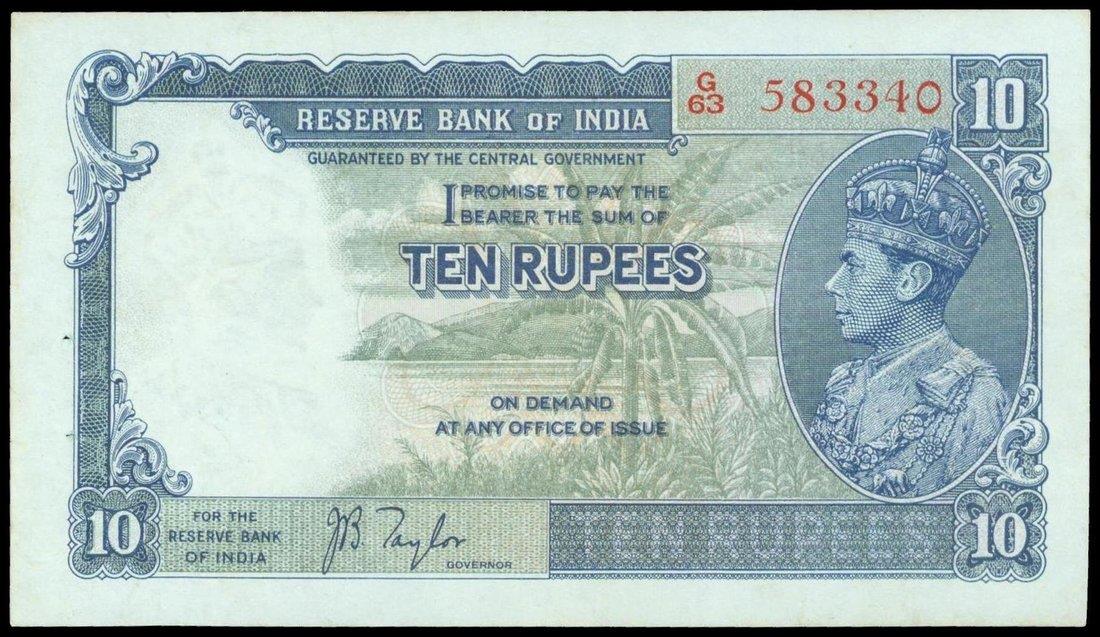 India,10 rupees, ND(1937), serial number G63 583340,blue, violet and olive, George VI at right, reverse light blue,