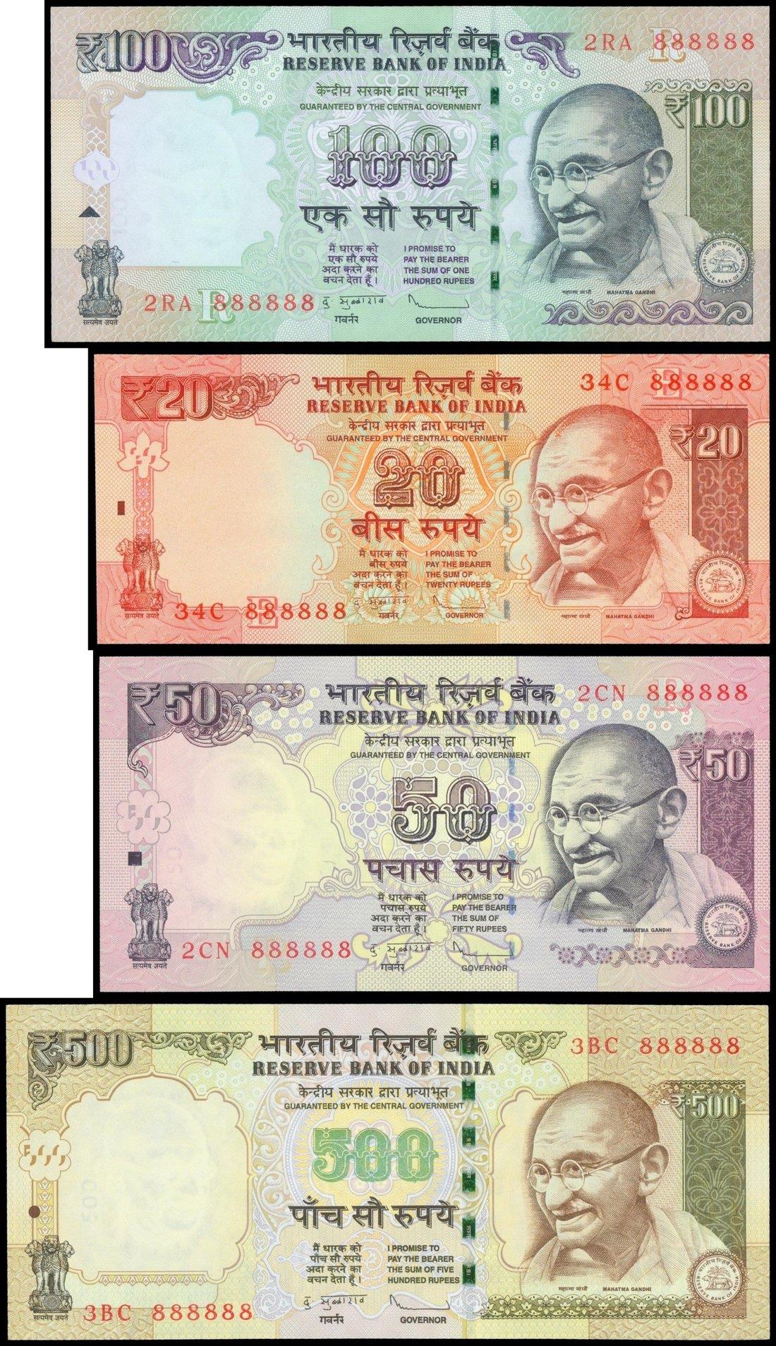 India,a lot of 20, 50, 100 and 500 rupees, ND(1996-2002), all with solid number 888888,red-orange, black purple, purple and olive, brown and olive green on multicolour underprint respectively, Gandhi at right,