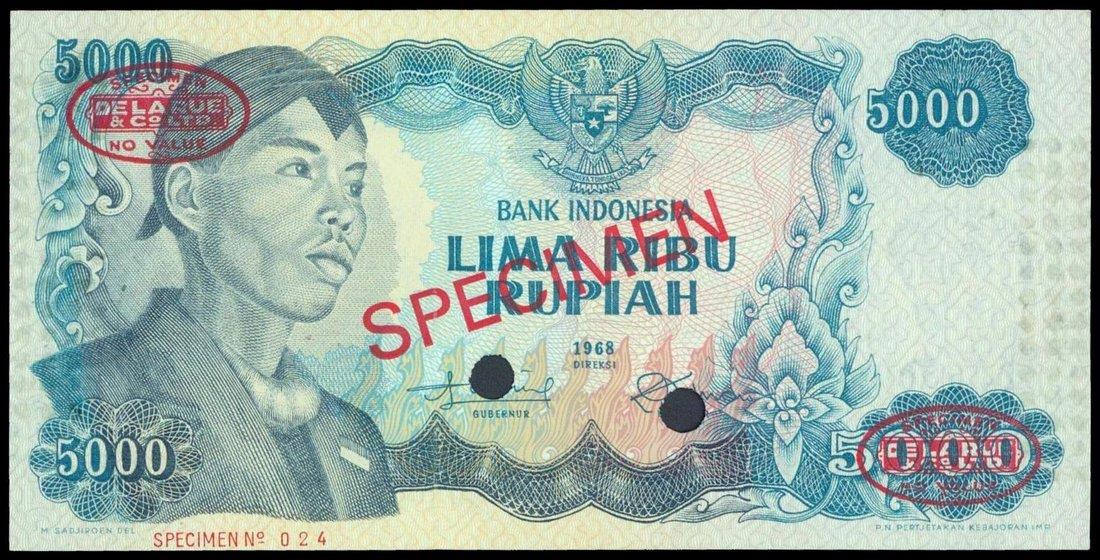 Indonesia, 5000 rupiah, specimen, 1968, serial number DA000000, blue-green on multicolour, General Sudirman at left, Tonasa cement plant on reverse, hole punch cancelled, overprinted 'SPECIMEN',