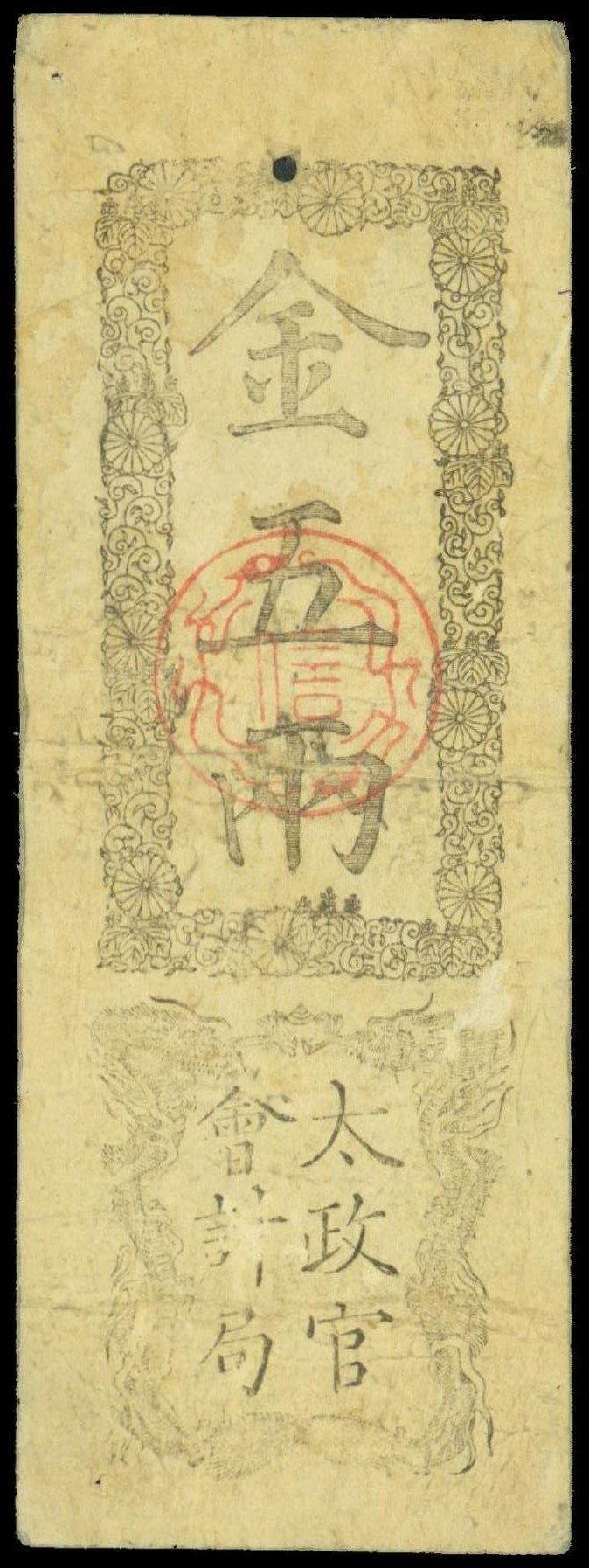 Japan, Dajoka-Satsu Gold Note, 5 ryo, 1868, vertical format, black on white card, facing dragons, red seal at centre,