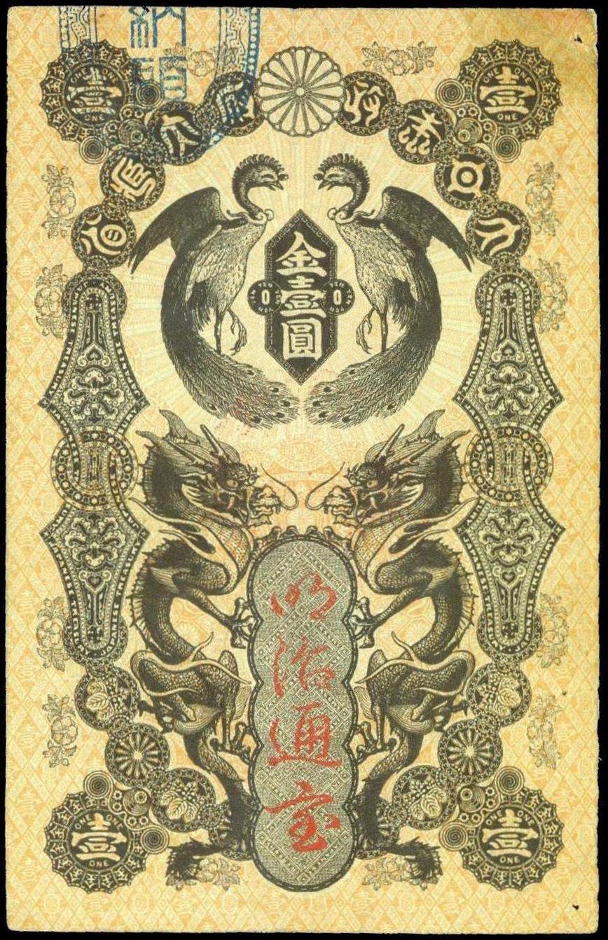 Japan, 1 yen, 1872, serial number 5781, vertical format, black on orange, facing onagadori cockerels at top, dragons at bottom, reverse blue, red seal at centre,