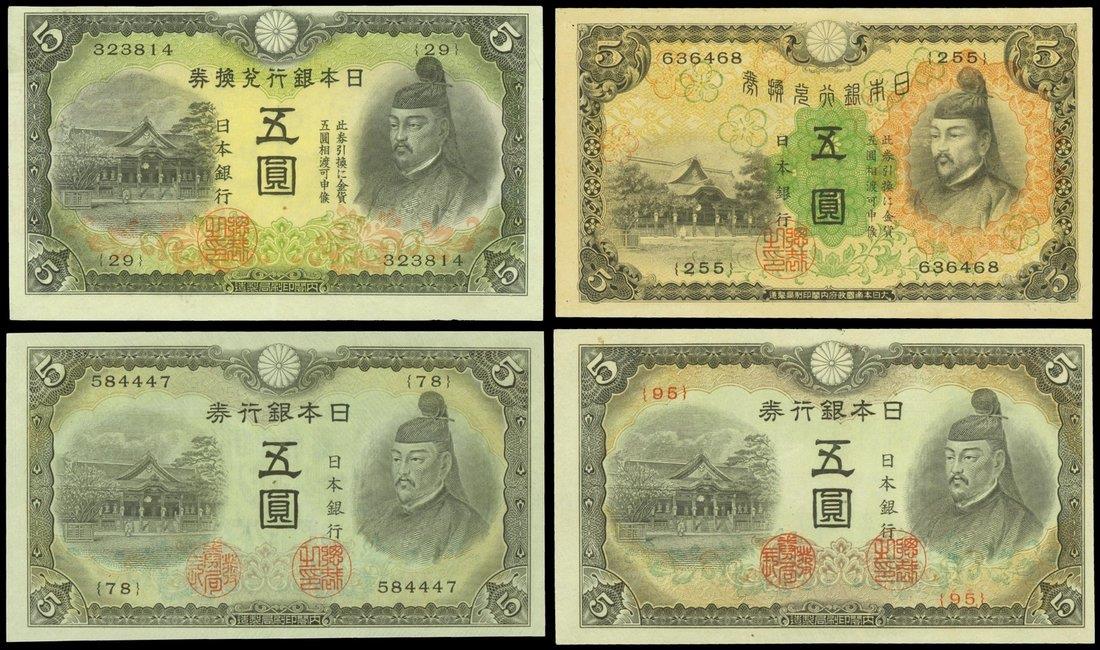 Japan, 4 different types of 5 yen, 1930, 1942, 1943-1944 and 1944,