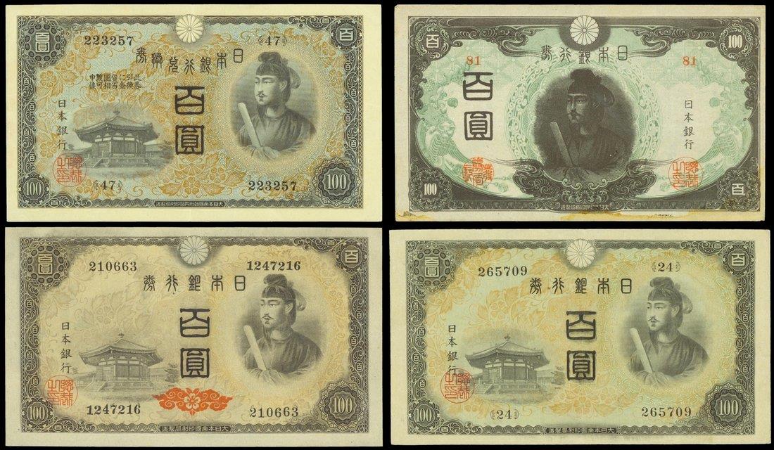 Japan, 4 different types of 100 yen, 1930, 1944, 1945, 1946,