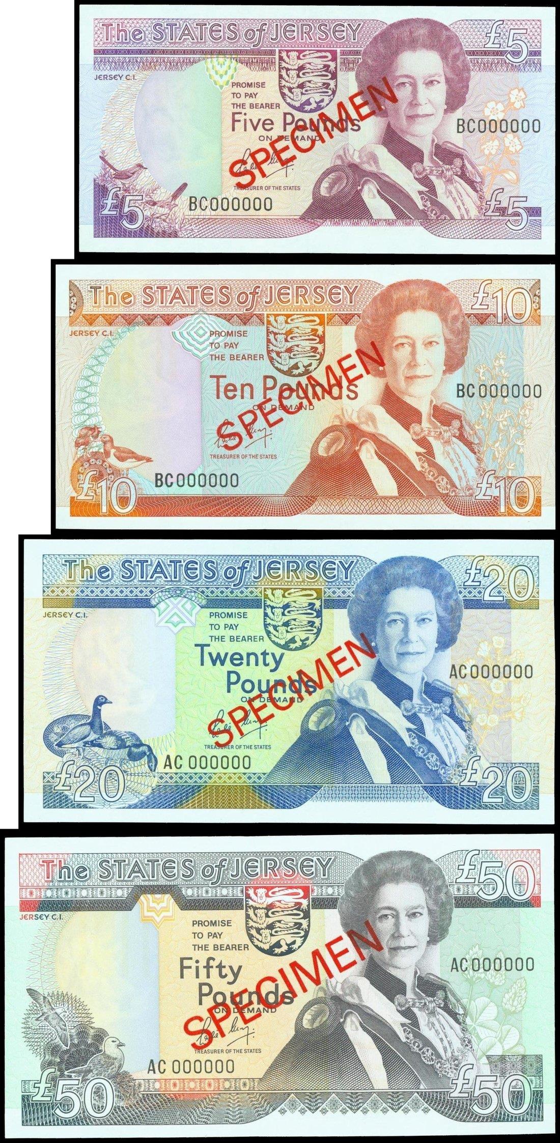 The States of Jersey,a set of £5, 10, 20 and 50, ND(2000), purple, orange, blue, dark grey on multicolour underprint respectively, Elizabeth II at right, red ‘Specimen’ overprinted on obverse and reverse,