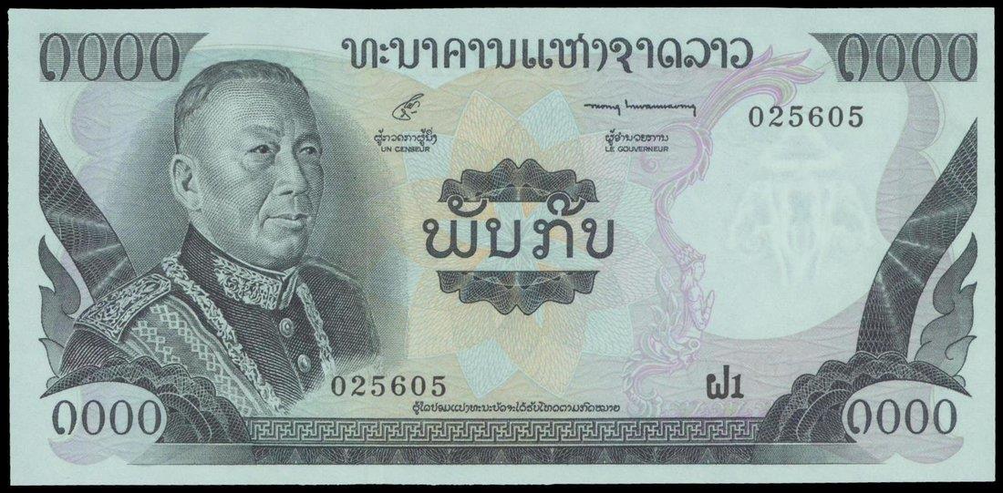 Laos,1000 kip, ND(1974-75), specimen,black on multicolour underprint, portrait at left, reverse dark green, elephant at right,