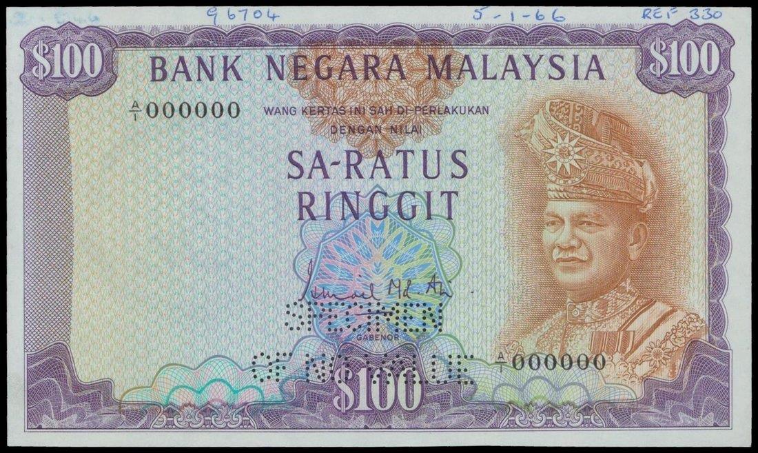 Malaysia, 100 ringgit, specimen, (1967-1972), serial number A/1 000000, purple and brown on multicolour, T.A. Rahman at right, reverse purple, coat of arms at centre, '$50' top left and right, perforated 'SPECIMEN OF NO VALUE',