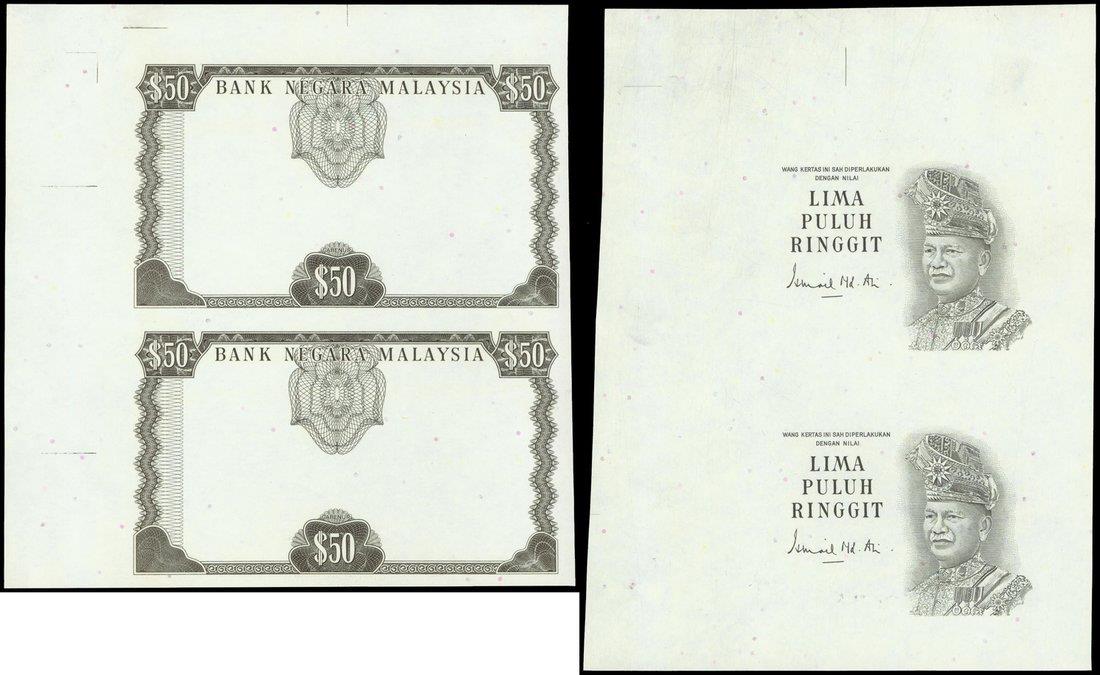 Malaysia, 50 ringgit, (1972-1976), two sheets of black and white die proofs of the border and T.A. Rahman, each sheet is an uncut pair,