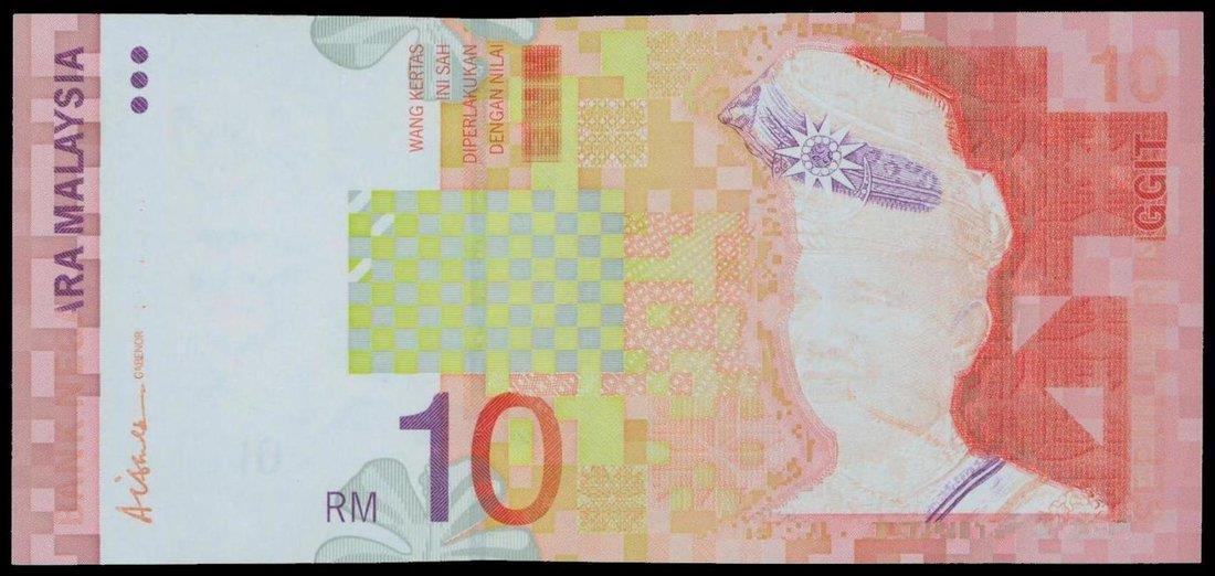 Malaysia,10 ringgit, ND(1999), printing error, serial number BB7410306, red on multicolour underprint, ink omitted on portrait,