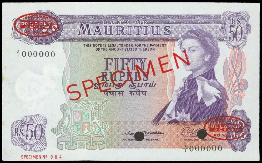 Mauritius, 50 rupees, specimen, no date (1967), serial number A/1 000000, purple and multicolour, The Queen at right, Port Lousi Harbour on reverse,