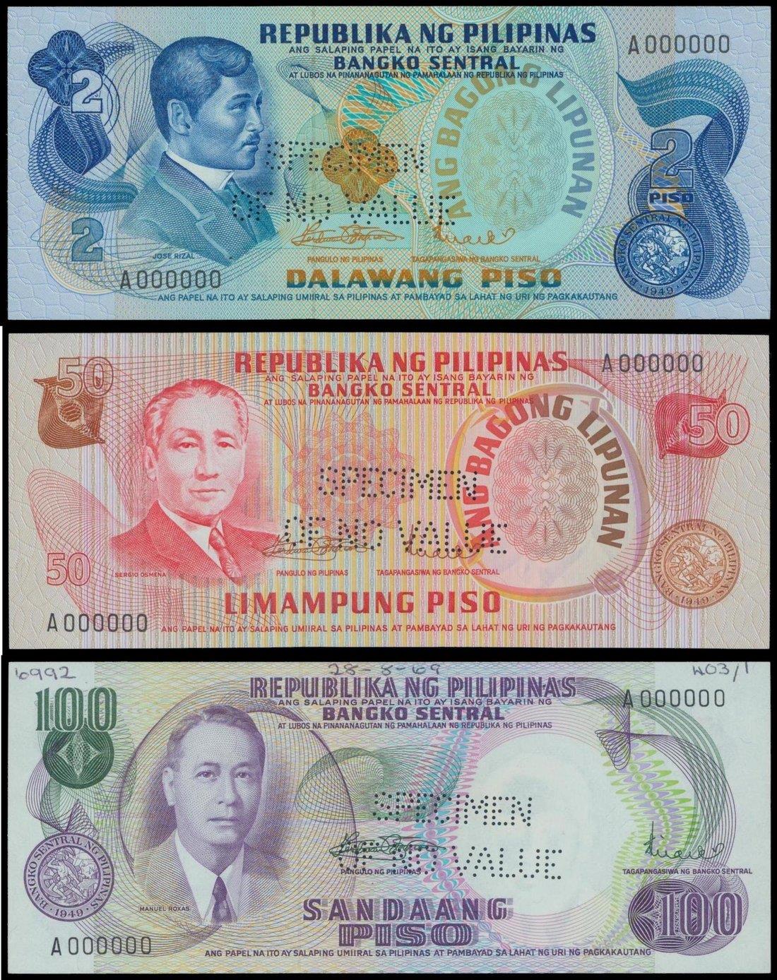 Philippines, group of 3 specimens for 2, 50 and 100 piso, no date (1970), blue, red and violet, various famous figures at left, all perforated 'SPECIMEN OF NO VALUE',