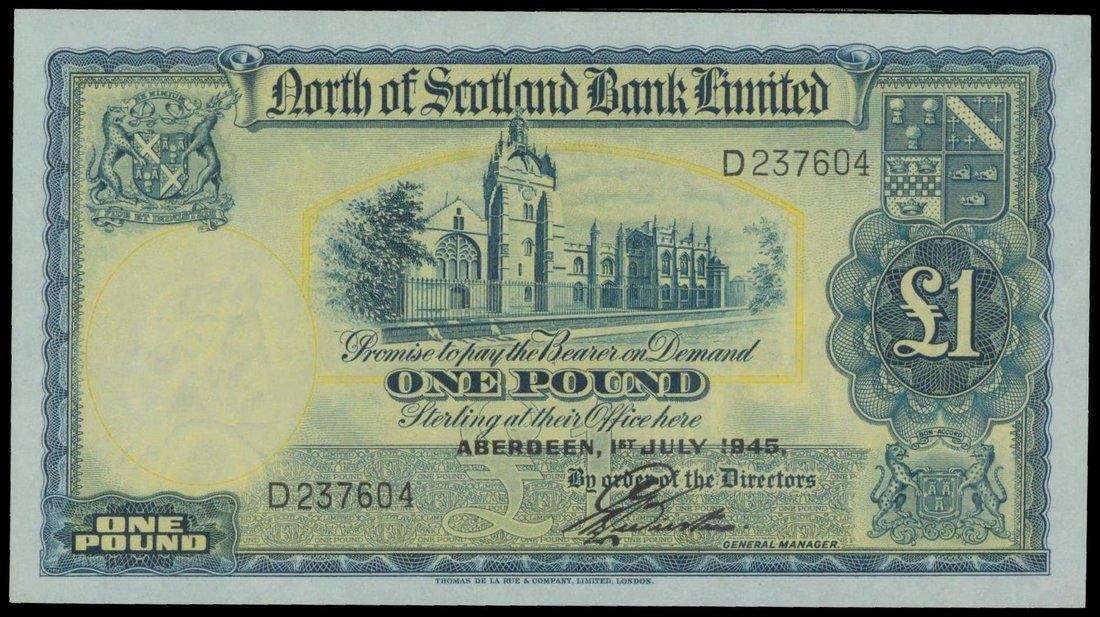 Scotland, North of Scotland Bank Limited, one pound, 1.7.1945, serial number D237604, blue and yellow, Marischal College at centre,