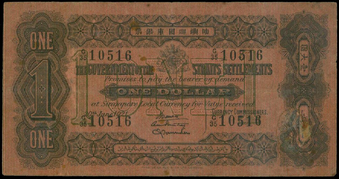 Straits Settlements,$1, 1921, serial number G/35 10516,black, arms at upper centre, reverse black, tiger at centre,
