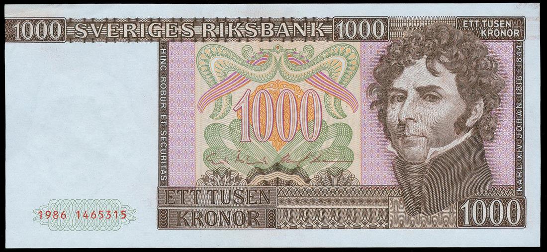 Sweden, 1000 kronur, 1986, serial number 1465315. brown and green, King Carl XIV at right, steel making scene on reverse,