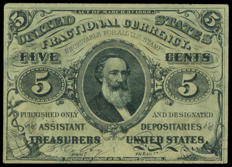 U.S.A.,5 cent, ND, 3rd Issue, Fractional Currency,black, small format, portrait at centre, value left and right, reverse green,