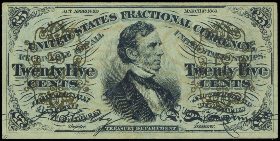 U.S.A.,25 cent, ND, 3rd Issue, Fractional Currency,black, small format, portrait at centre, value left and right, reverse green,