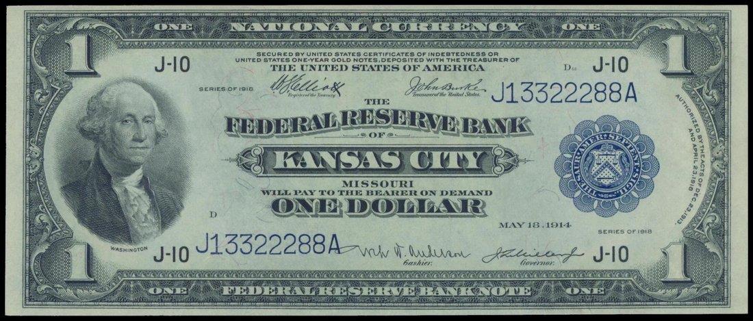 United States, The Federal Reserve Bank, $1 National Currency, Kansas City, serial of 1918, J-10, serial number J13322288A, George Washington at left, blue seal at right, reverse green, flying eagle, signed by Elliott, Burke, Anderson and Miller,
