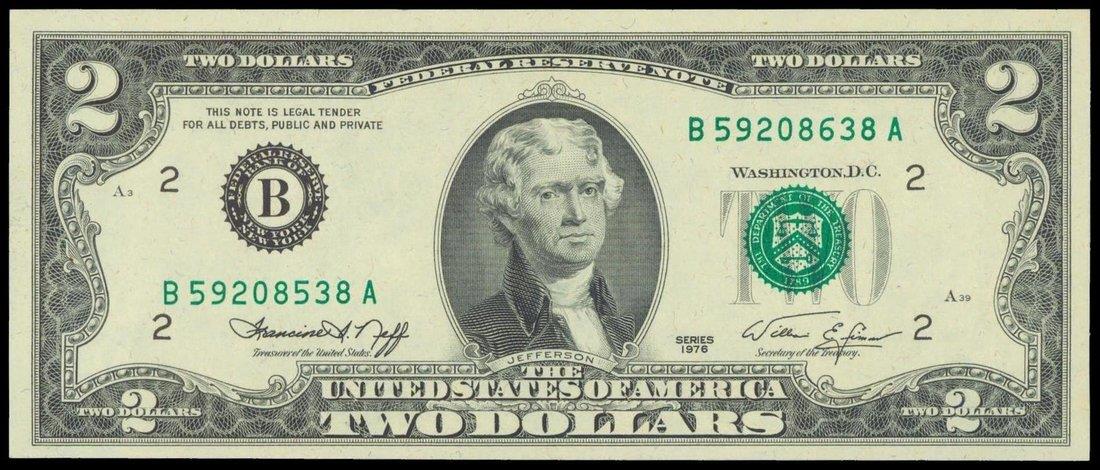 United States, $2, 1976, ERROR MISMATCHING SERIAL NUMBERS, B59208538A/B59208638A, Thomas Jefferson at centre,