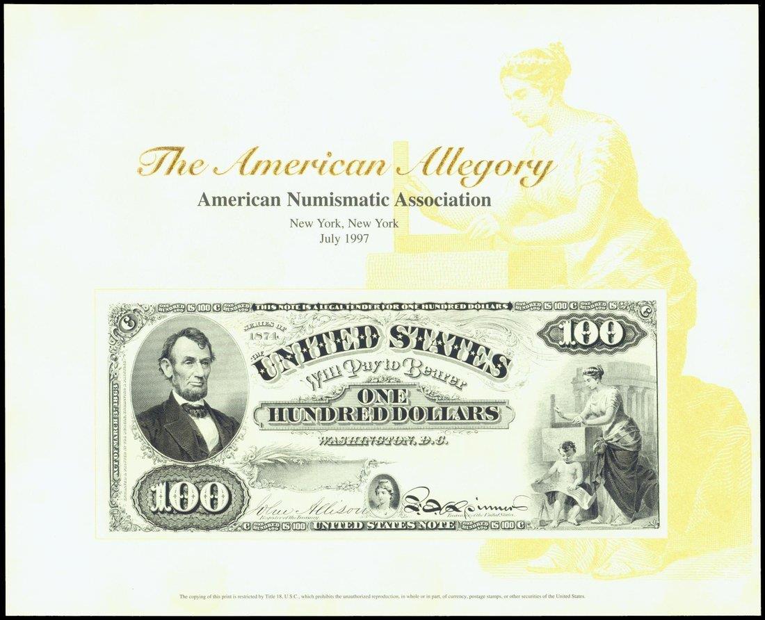 United States, uniface obverse of a $100, c. 1870's, depicting Abraham Lincoln on the left, an unissued type, reprint from the American Numismatic Association,
